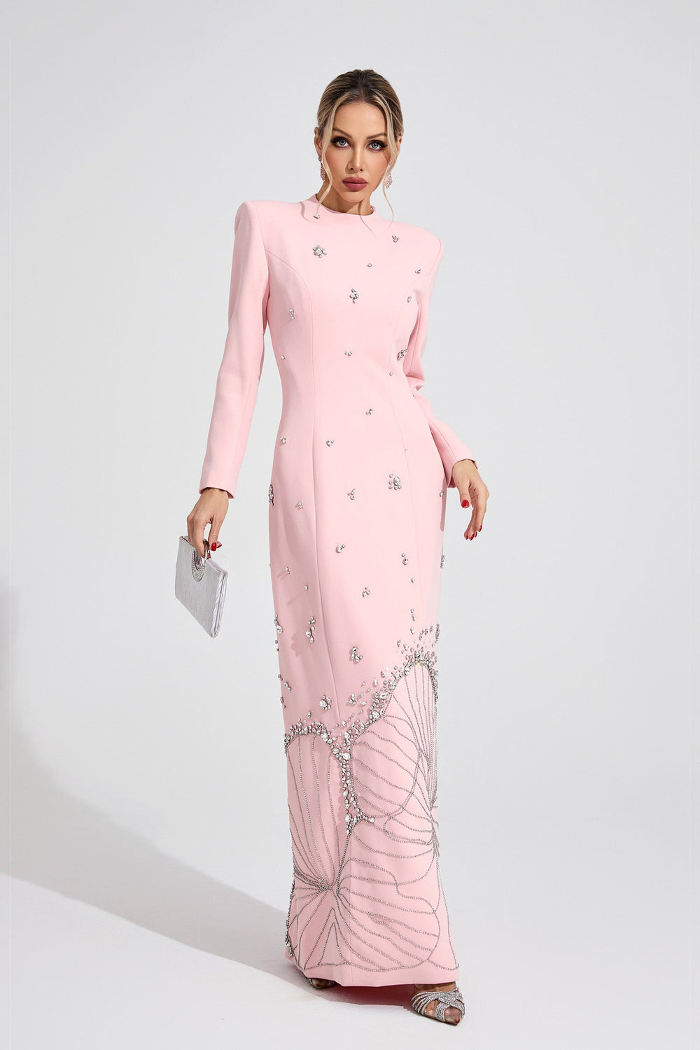 Radiate softly luminous, crystal-scattered elegance in the Baby Pink Crystal Beaded Mock Neck Long Sleeve Maxi Dress—perfect for galas and red carpet occasions for women who wear blushing glamour and delicate beaded artistry with effortless, starlit grace.