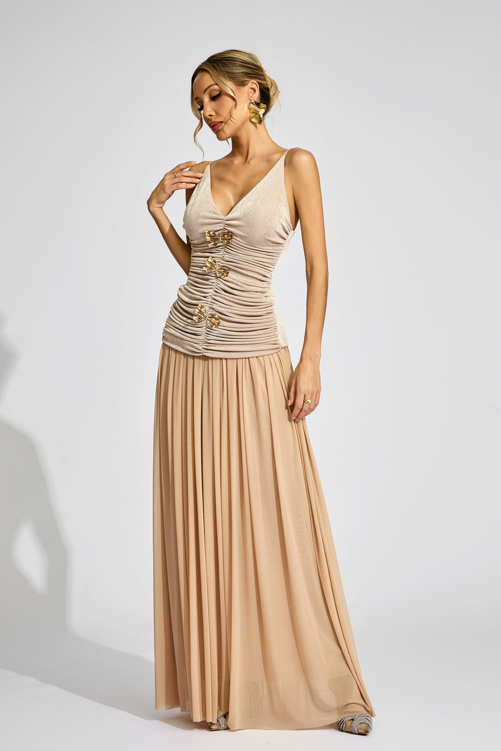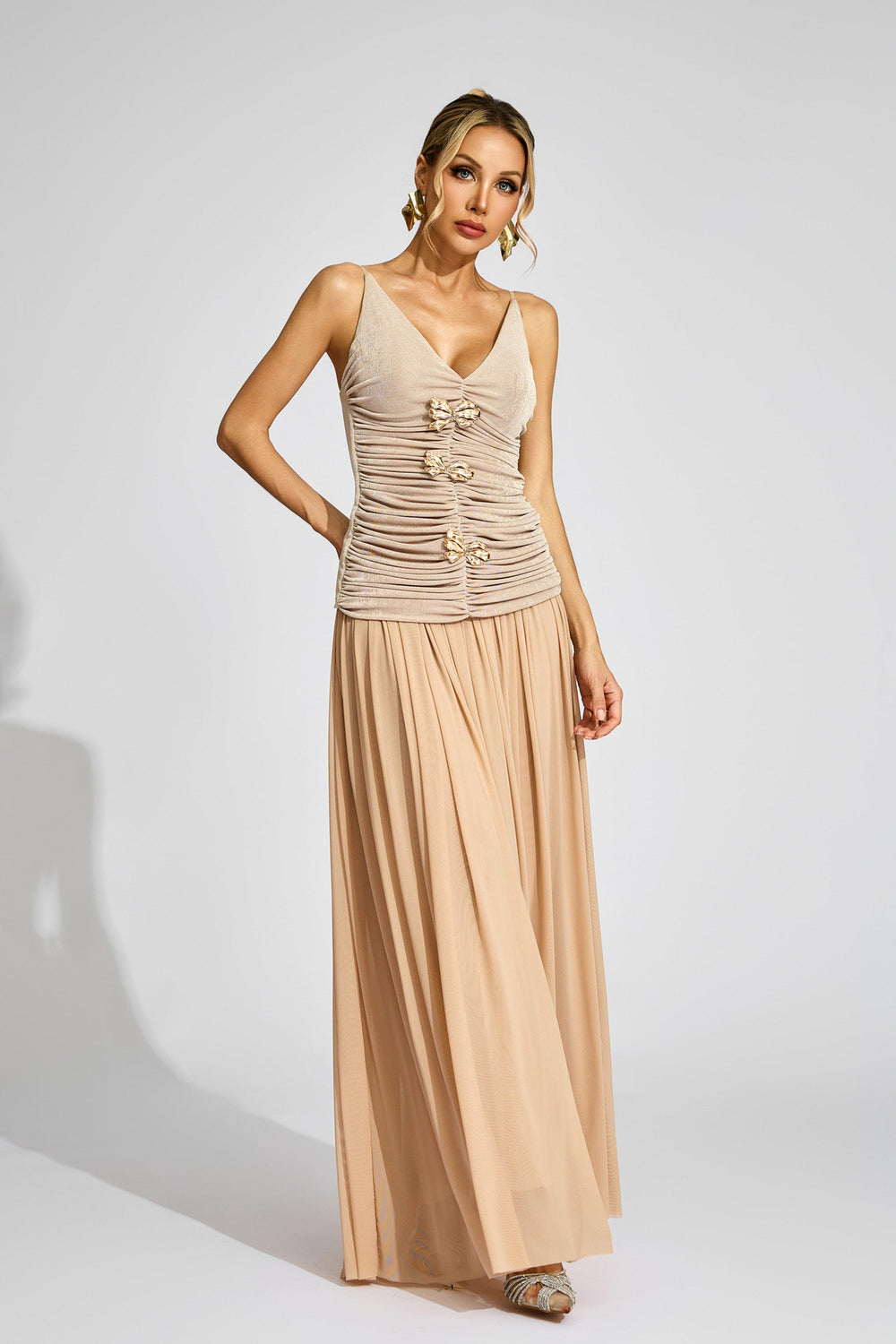 Embrace refined elegance with the Beige Ruched Top Maxi Skirt Set - V-Neck 2 Piece—a sophisticated ensemble perfect for upscale gatherings and special occasions for women who appreciate exquisite ruching artistry with contemporary suspender styling and party-ready sophistication.