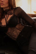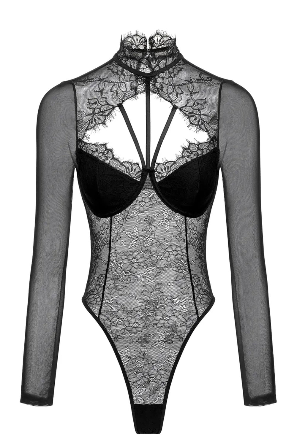 Embrace darkly confident sensuality in the Black Floral Lace Sheer High Neck Long Sleeve Strappy Bodysuit—perfect for nights out and intimate occasions for women who wear sheer lace and feminine boldness with effortless, unapologetic confidence.
