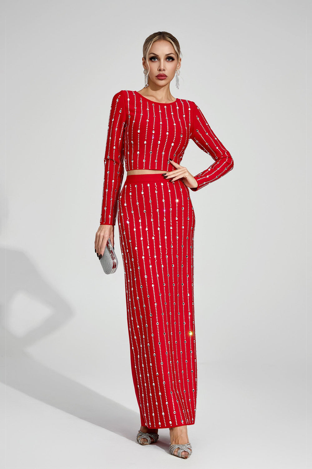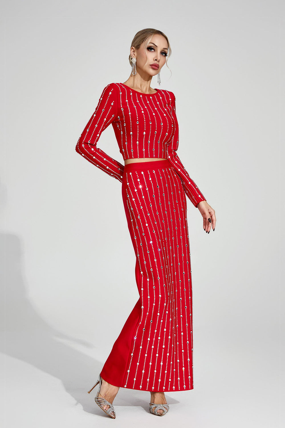 Own every room in bold, rhinestone-adorned crimson with the Red Rhinestone Sleeve Crop Top Maxi Skirt Co-ord Set—perfect for parties and upscale events for women who wear confidence, glamour, and fierce, unapologetic colour as one seamless, electric statement.