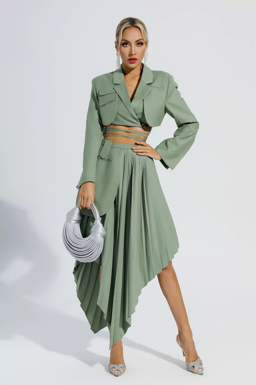 Lead with refined, fashion-forward confidence in the Sage Green Crop Blazer Pleated Asymmetric Midi Skirt Set—perfect for stylish workdays and seasonal occasions for women who find their most effortless elegance in beautifully considered, asymmetric design.