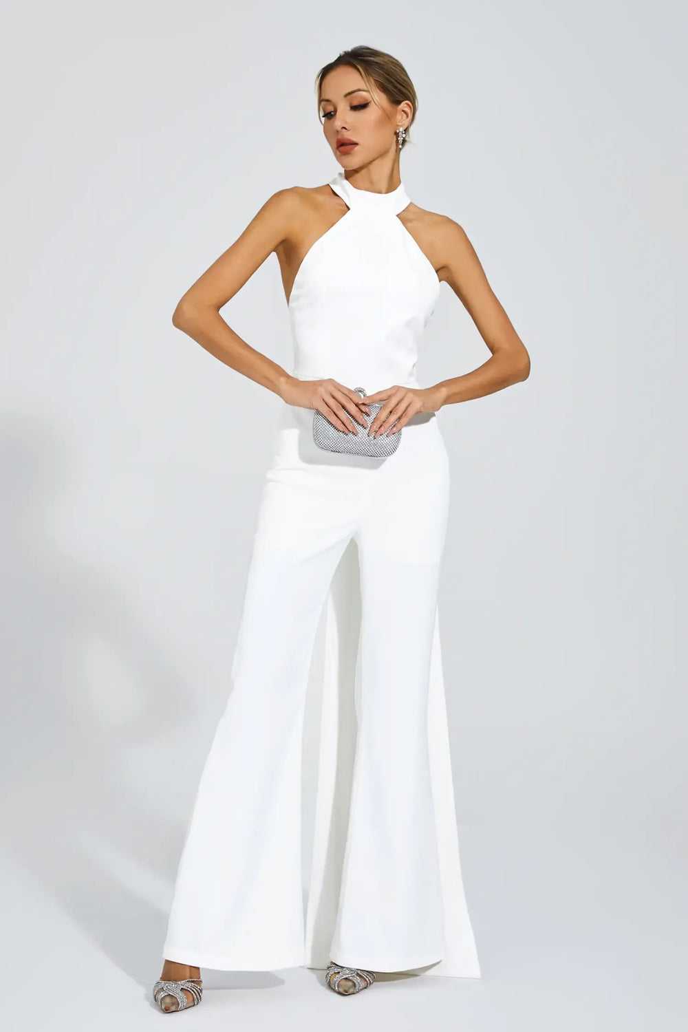 Command pristine, backless elegance in the White Mock Halter Neck Sleeveless Open Back Flare Leg Jumpsuit—perfect for formal gatherings and special occasions for women who wear open-back sophistication and flared glamour with effortless, luminous confidence.